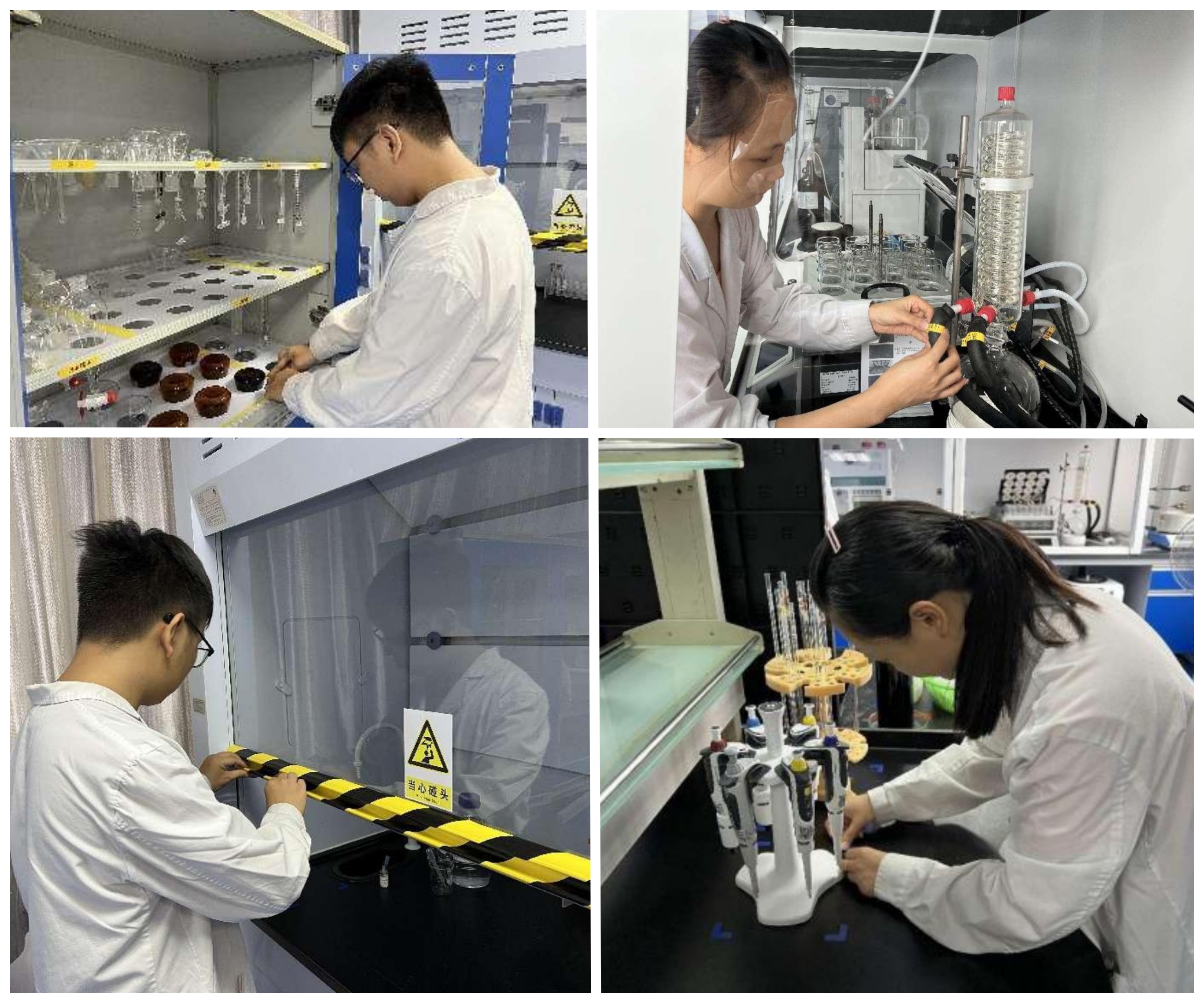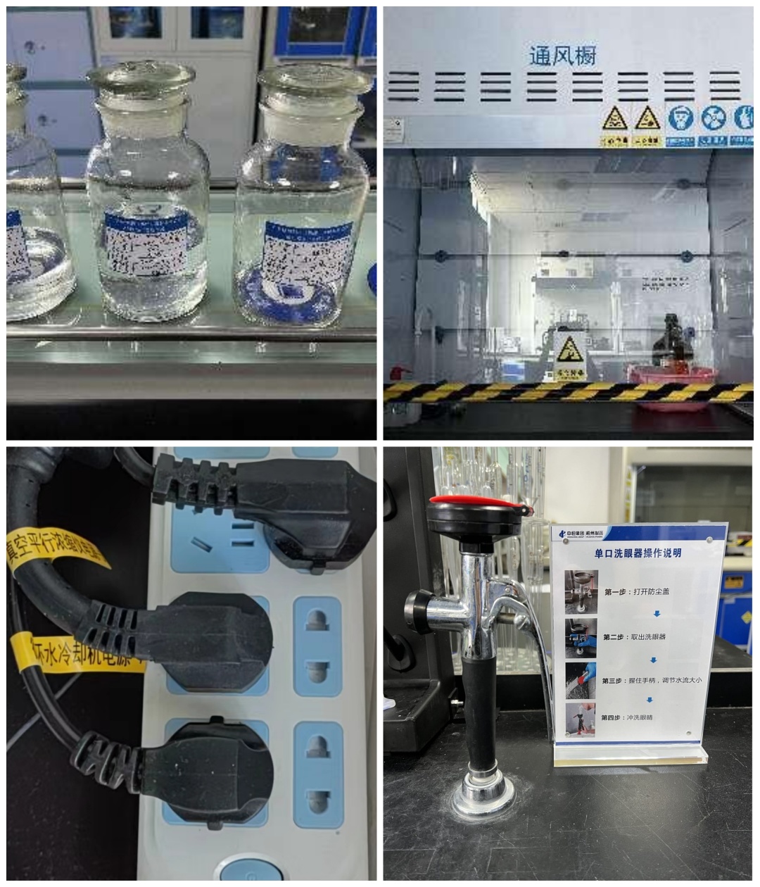 安全是企業(yè)的生命。實驗室內(nèi)存放的試劑、各種檢驗操作均存在一定的風(fēng)險,做好安全警示,既是保證安全檢驗,也是人員健康的一大保障。將試劑按酸(紅)、堿(黃)、普通(藍)、有毒(黑)分類標識,標識后試劑屬性及風(fēng)險清晰明了。在通風(fēng)櫥增加黃黑警示線及安全警示標示等,提醒人員做好安全防護。梳理管道、電源線走向與標識,在緊急狀態(tài)下能快且準地拔插頭斷電。應(yīng)急處理的洗眼器旁放置操作方法標示,便于緊急狀況下的準確操作。這一系列舉措極大提高了檢驗工作的安全性。