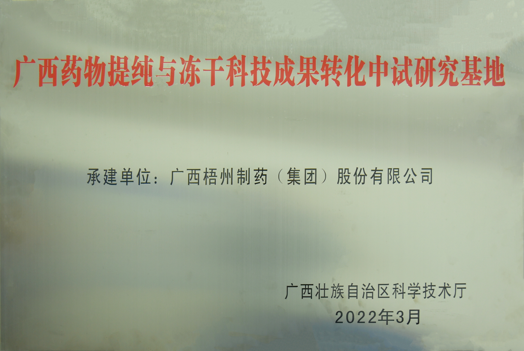 廣西梧州制藥(集團(tuán))股份有限公司評(píng)為廣西藥物提純與凍干成果轉(zhuǎn)化中試研究基地