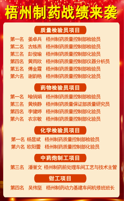 其中,姜卓兵、古煉燕、彭俊瑜、黃雨欣、傅金霞、謝韻艷包攬了質(zhì)量檢驗員項目的前六名殊榮;喻俏娟、黃煥靜、李健婷、農(nóng)宗敏在藥物檢驗員項目中分別榮獲第一、第三、第四、第六名;楊顯斌、歐陽蕾在化學(xué)檢驗員項目中分別榮獲第一和第六名;潘譽文在中藥炮制工項目榮獲第三名;吳偉堅在鉗工項目中榮獲第四名。