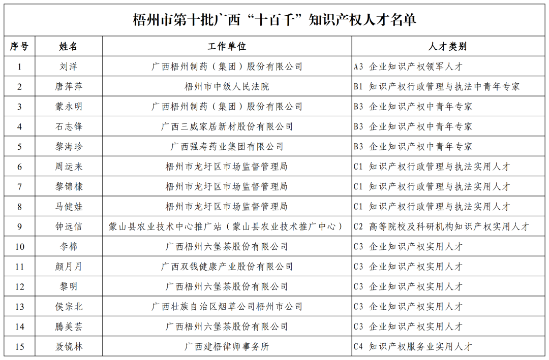 近日,自治區(qū)市場(chǎng)監(jiān)管局公布第十批廣西“十百千”知識(shí)產(chǎn)權(quán)人才名單,廣西梧州制藥(集團(tuán))股份有限公司副董事長(zhǎng)、總經(jīng)理劉洋同志獲“A3企業(yè)知識(shí)領(lǐng)軍人才”稱號(hào),藥學(xué)事務(wù)部知識(shí)產(chǎn)權(quán)專員蒙永明同志獲“B3 企業(yè)知識(shí)產(chǎn)權(quán)中青年專家”稱號(hào)。