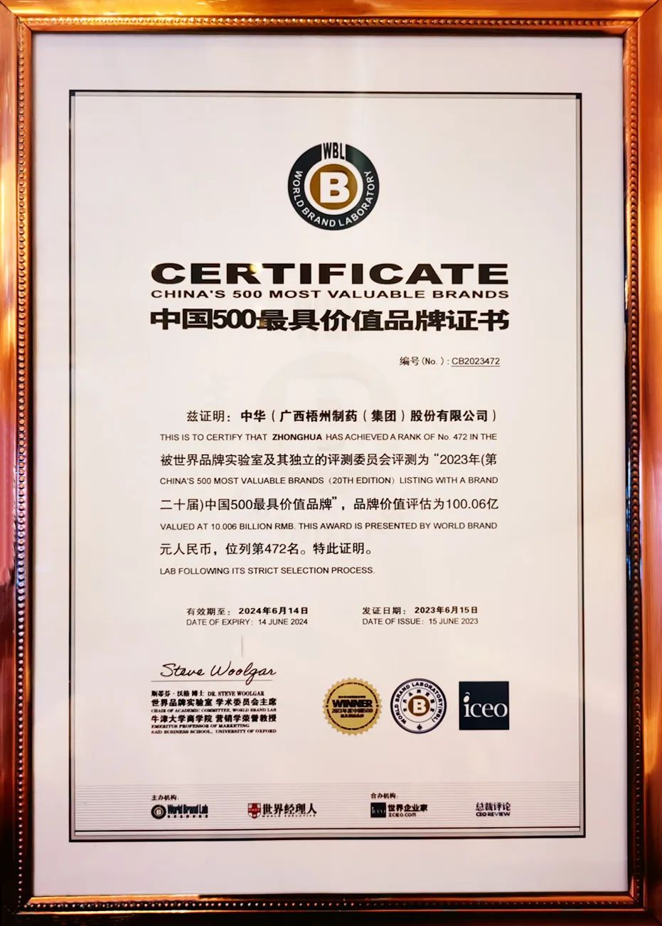 中華跌打丸為梧州制藥獨(dú)家生產(chǎn)品種,自1966年批準(zhǔn)生產(chǎn)至今已經(jīng)臨床應(yīng)用五十余年,先后收錄于2005版、2010版、2015版、2020版、2025版《中國(guó)藥典》,憑借其顯著的消腫止痛、舒筋活絡(luò)、止血生肌、活血祛瘀功效,在骨科治療領(lǐng)域深受認(rèn)可。曾獲國(guó)家醫(yī)藥管理總局優(yōu)質(zhì)產(chǎn)品獎(jiǎng)、中華人民共和國(guó)國(guó)家質(zhì)量獎(jiǎng)銀獎(jiǎng)等榮譽(yù)稱(chēng)號(hào),核心發(fā)明專(zhuān)利榮獲中國(guó)專(zhuān)利優(yōu)秀獎(jiǎng),廣西發(fā)明創(chuàng)造成果展覽獎(jiǎng)。其產(chǎn)品商標(biāo)是目前我國(guó)醫(yī)藥領(lǐng)域唯一一個(gè)獲準(zhǔn)使用的“中華”商標(biāo),2023年“中華”品牌入選世界品牌實(shí)驗(yàn)室發(fā)布的“中國(guó)500最具價(jià)值品牌”榜單,品牌價(jià)值評(píng)估超100億元,為當(dāng)年度廣西唯一入選該榜單的醫(yī)藥品牌。